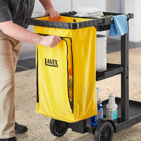 This Lavex yellow vinyl janitor cart bag with zipper is the perfect cleaning companion!