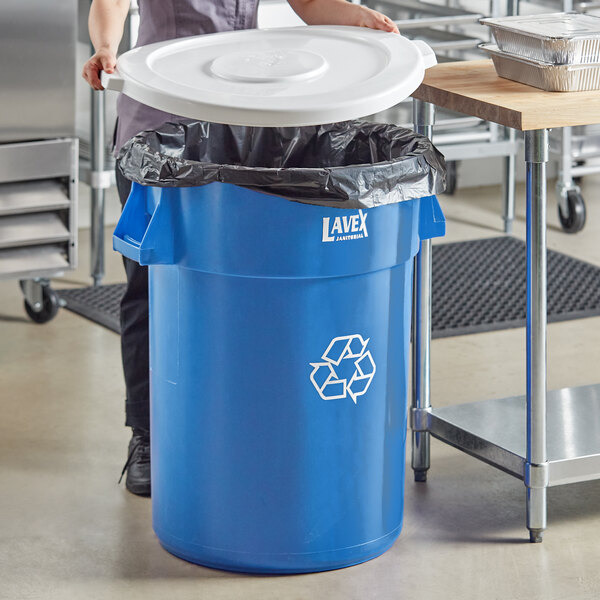 Manage waste and keep your space clean with this Lavex 44 gallon blue round commercial recycling can with white lid.