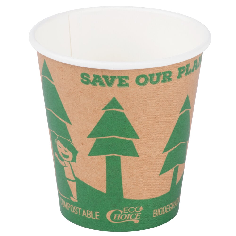 Provide sanitary, disposable drinking cups in your hotel or motel rooms with this Lavex 10 oz. kraft tree print hot cup with tree design!