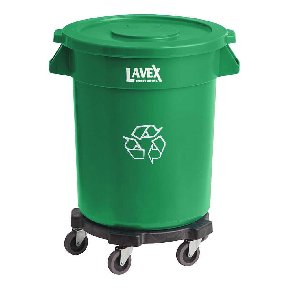 20 Gallon Green Round Commercial Recycling Can with Green Lid and Dolly