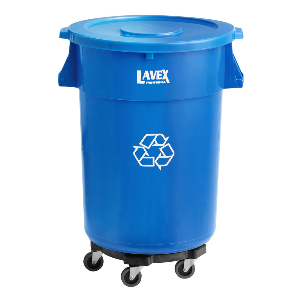 44 Gallon Blue Round Commercial Recycling Can with Blue Lid and Dolly
